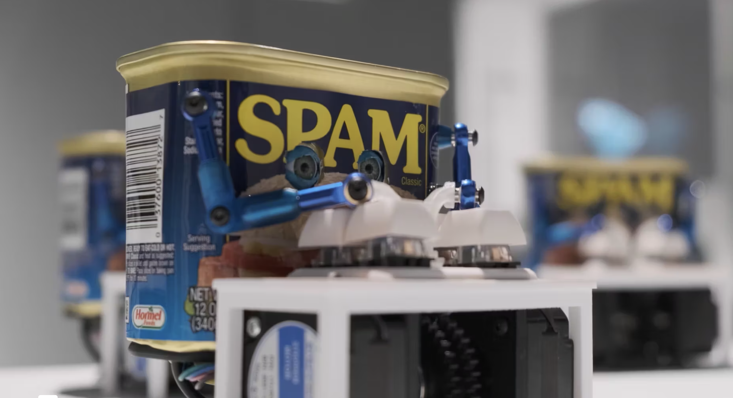 Avec SpamBots, Neil Mendoza met en scène poétiquement et de manière ironique la surproduction numérique. Dans Spambots, des boîtes de conserve devenues conteurs robotiques génèrent collectivement des textes inspirés du Meilleur des Mondes d’Alfred Huxley.