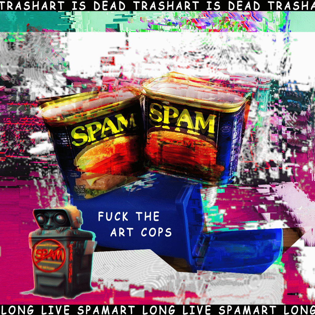 Né dans les communautés crypto-art NFT de Discord et Twitter, le mouvement SPAM ART développe un langage esthétique reconnaissable : humour, couleurs criardes, typographies délirantes, compositions aberrantes avec la boîte iconique du SPAM.